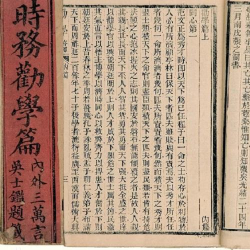 1898年5月5日,张之洞正式发表其精心撰写的《劝学篇》,全文共24篇,4万余言,前后贯穿"旧学为体,新学为用"的论点,主张在维护封建统治的基本原则下接受西方资本主义的技术,深得慈禧太后和光绪帝的赏识,得以"挟朝廷之力以行之,不胫而遍于海内"。先后译成英、法文出版。1900年纽约版易名为《中国唯一的希望》发行于海外。